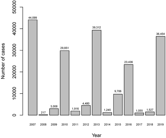 Figure 1 shows the number of recorded dengue-fever cases from 2007 to 2019. The figure includes the number of cases recorded in 2007 just to show that every three years the city of Campo Grande presents a larger outbreak of dengue-fever cases. However, the recorded number of dengue-fever cases in 2007 was not considered to fit the models because the website https://www.cemtec.ms.gov.br (accessed on 8 December 2020) does not include values for the explanatory variables to in 2007.