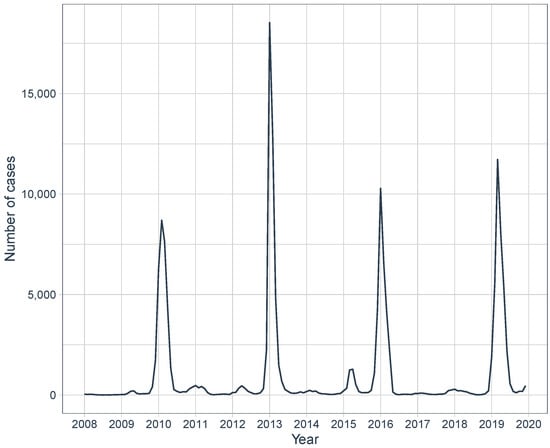 Evolution of the number of dengue-fever cases by month in the period considered (January 2008 to December 2019).