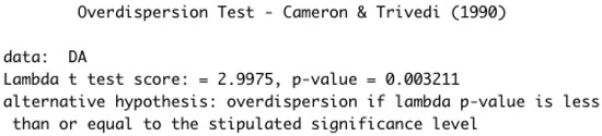 Trivedi [24] (CT test), using the overdisp() function of the R software. Figure 3 shows the output of the test in the R software. As one can note, the null hypothesis is rejected for the usual significance levels , meaning that there is evidence for overdispersion.