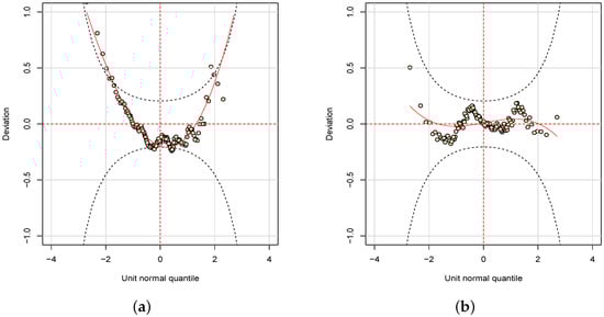 Figure 4 shows the normal quantile-quantile plot (q-q plot) for the randomized quantile residuals of the NBR-S and PIGR fitted models. The q-q plot is a scatterplot created by plotting the empirical quantiles of the residuals against the theoretical quantiles of the normal distribution. If residuals are normally distributed then they should form an approximately straight line. Figure 5 shows the worm plot. This graph was proposed by van Buuren and Fredriks [31] to identify regions (intervals) of the explanatory variable within which the model does not fit the data adequately [15]. In this graph, the upwardsline of the q-q plot is rotated to the horizontal in order to remove the trend and the Y axis contains the difference between its location in the theoretical and empirical distributions. If the residuals follow a normal distribution then the Y values are near the horizontal line and consequently inside the confidence band. The R function wp() provides the worm plot for a gamlss fitted model. As one can note, both figures indicate the PIGR model performs better than the NBR model. In addition, the graphs of the residuals from the PIGR model indicate that there is no reason to worry about the inadequacy of the fit. Table 6 shows the estimates for the parameters of the PIGR model.