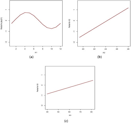 Figure 6 shows estimated relationships between the response variable and explanatory variables. As expected, the relationship with (month) presents a cyclical behavior, and the relationship with and is linear. These graphs were constructed using the term.plot function of the R software.