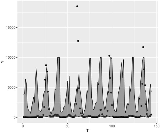 Figure 7 shows the number of registered dengue cases (symbol •) and a confidence band of generated from the fitted PIGR model. In order to construct the confidence band we use a parametric bootstrap. That is, from estimated value and , we generate values from a PIG distribution using the rPIG function of the R software. Then we set the lower and upper limits as being the percentiles and of the generated values. As one can note, the fitted model indicates that every year a peak will occur. How high or low the recorded number of dengue cases will be in relation to the expected peak (given by the fitted model) is controlled by action taken to combat the proliferation of the mosquito. If such action is effective, there is no occurence of a peak, as in years 2008, 2009, 2011, 2012, 2014 and 2017. Otherwise, the peak may be higher than expected, i.e., there may be a larger outbreak, as in the years 2010, 2013, 2016 and 2019. That is, human behavior has a great influence on the number of cases that will be recorded. However, since this behavior is very difficult to quantify and is not present in the proposed model, this also has an influence on the predictive performance of the fitted model.