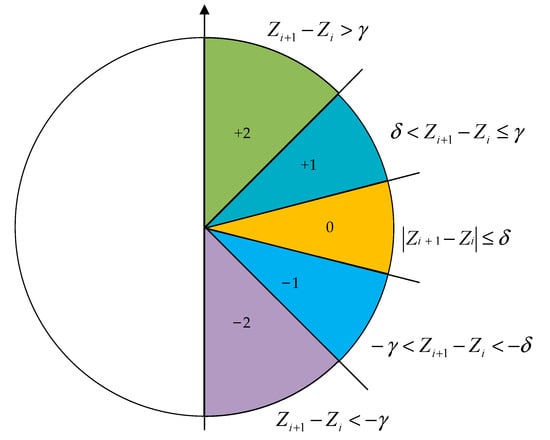- Step 2: Dividing symbolic patterns by two thresholds ( and ). If , the symbol is defined as +2; if , the symbol is defined as +1; if , the symbol is defined as 0; if , the symbol is defined as −1; and if , the symbol is defined as −2, where . Figure 1 shows the division of symbol patterns.