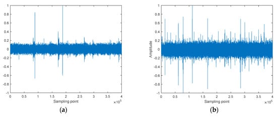 Four types of S-NSs were used in the feature extraction experiments, consisting of Ship-1, Ship-2, Ship-3, and Ship-4. Ship-1 and Ship-2 were obtained from a database named ShipsEar (Available at: http://atlanttic.uvigo.es/underwaternoise/, accessed on 13 July 2022) and represent an ocean liner and a motorboat, respectively. Ship-3 and Ship-4 were obtained from the official website of the National Park Service (Available at: https://www.nps.gov/glba/learn/nature/soundclips.htm, accessed on 15 July 2022) and represent an Alaska state ferry and a cruise ship, respectively. For all four types of S-NSs, the sampling point’s length was 400,000. Figure 3 shows the normalized waveform of the four types of S-NSs.