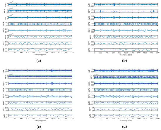 All four types of S-NS were decomposed into several IMFs using CEEMDAN. For each type of S-NS, there were 200 samples and each sample consisted of 2000 sampling points. For CEEMDAN, the noise standard deviation was set to 0.2, the number of noise additions was 500, and the maximum number of sifting iterations permitted was 3000. The decomposition results for one sample of the four types of S-NSs decomposed by CEEMDAN are shown in Figure 4.