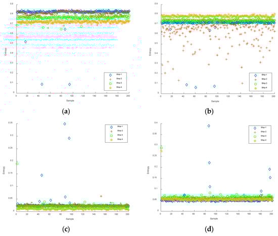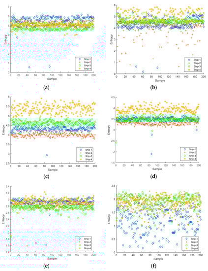 Figure 9 shows that, for Slopen, the distribution of features belonging to each type of S-NS was highly concentrated and there was little overlap. In addition, for DE, RDE, and FDE, the feature distribution of Ship-2 was highly scattered, and the entropy values of Ship-3 and Ship-4 were similar; especially for RDE, in which the entropy values for all four types of S-NSs were very close. The highest average recognition rates of the dual-IMFs of the four types of entropies are shown in Table 4.