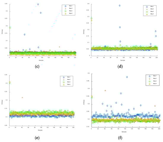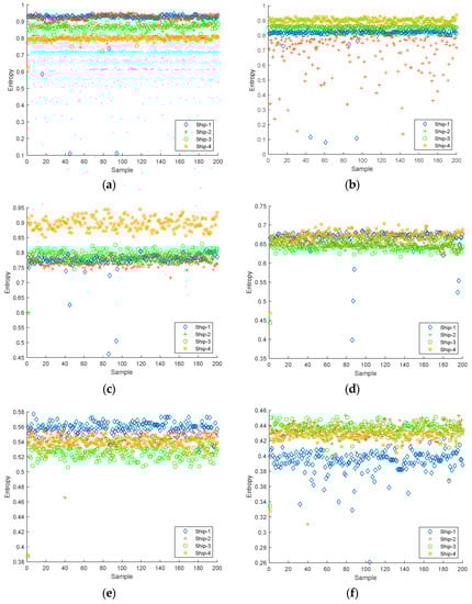 As can be seen from Figure 5, Figure 6, Figure 7 and Figure 8, within the four types of entropies, the distributions of SN-Ss in different IMFs were relatively chaotic and the overall entropy value became smaller from IMF1 to IMF6. Compared with the other five IMFs of Slopen, the Slopen values of the four types of S-NS in IMF3 had more apparent differences and less overlap in their distributions. For the same IMF, the Slopen value was higher compared to DE, FDE, and RDE. For DE, compared to IMF3 to IMF6, the entropy values of Ship-3 and Ship-4 in IMF1 and IMF2 were significantly different. The difference between the DE values of Ship-2 and Ship-3 was small from IMF3 to IMF6. The RDE values of the four types of S-NSs from IMF1 to IMF6 were very similar compared to the other three types of entropies, and the RDE value of the majority of samples was below 0.25. Regarding FDE, the entropy values of the SN-Ss in IMF1, IMF2, IMF3, and IMF4 were very close to each other. Moreover, the entropy values of the first four IMFs were mostly within the range of 0.4–0.9, while the last two IMFs fluctuated between 0.08 and 0.36. Among the six IMFs, the differences between the distributions of the four types of S-NSs were most evident in IMF2.