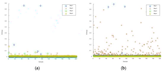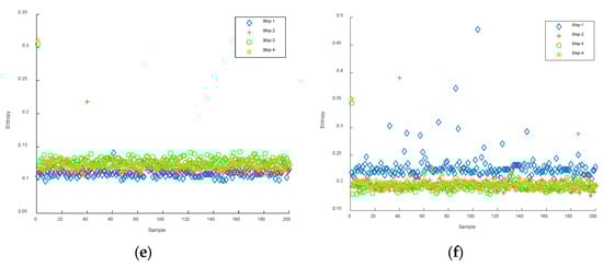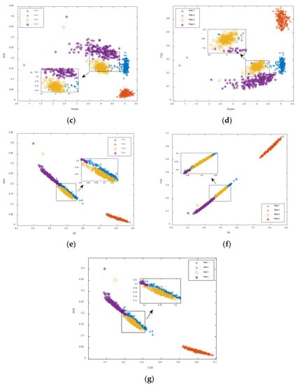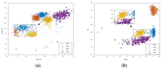 We also compared the dual-feature approaches, which directly extracted two of the entropies for the four types of S-NSs. The distributions of the proposed CEEMDAN-Dual-Slopen approach and the dual-feature extraction approaches are shown in Figure 10. In Figure 10a, Slopen(3) and Slopen(5) represent the Slopens of IMF3 and IMF5. In Figure 10b, Slopen and DE represent both the Slopen and DE of S-NSs, and so on for Slopen and DE, Slopen and RDE, etc.