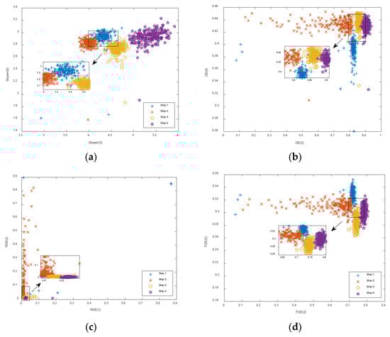 The feature distribution of the highest recognition rate of four types of entropies using the dual-IMF feature. (a) Slopen; (b) DE; (c) RDE; (d) FDE.