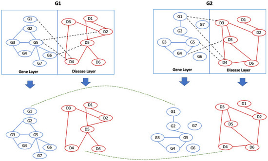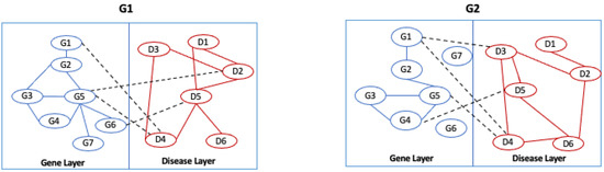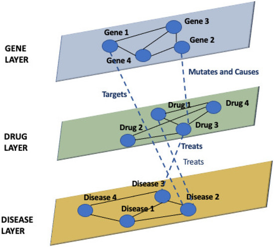 Figure 2 represents an example of a biological multilayer network representing the interplay among diseases, genes, and drugs.