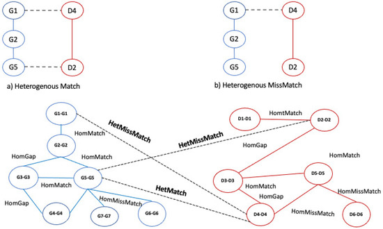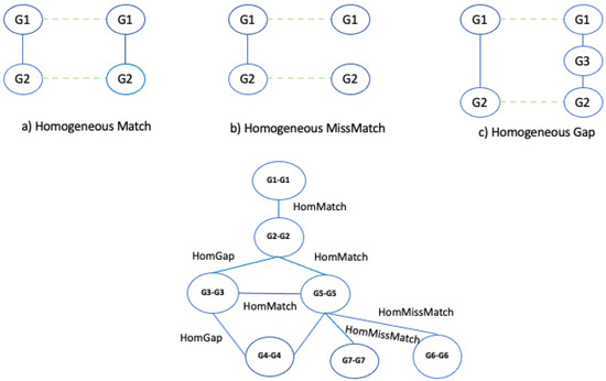 Once all nodes have been added to the graph, the algorithm builds the edges of the alignment graphs. For each pair of nodes, the algorithm examines the two input graphs, and it inserts and weights the edges considering three conditions: match, mismatch, and gap. Let us consider the nodes of the alignment graphs; in particular, let us consider the pair of nodes