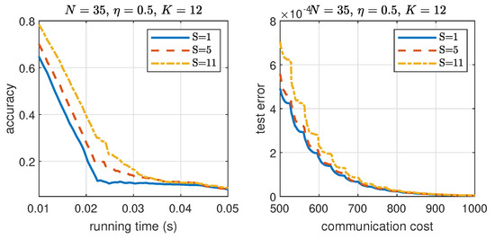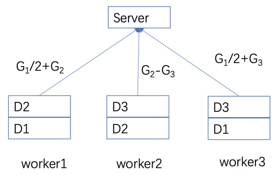 With the fast development of computing and communication technologies, and emerging data-driven applications, e.g., IoT (Internet of Things), social network analysis, smart grids and vehicular networks, the volume of data for various intelligent systems with machine learning has increased explosively along with the number of involved computing nodes [1], i.e., in a large scale. For instance, learning systems based on MAPReduce [2] have been widely used and may often reach the data volume of petabytes (10 bytes), which may be produced and stored in thousands of separated nodes [3,4]. Large-scale machine learning is pervasive in our societies and industries. Meanwhile, it is inefficient (sometimes even infeasible) to transmit all data to a central node for analysis. For the reason, distributed machine learning (DML), which stores and processes all or parts of data in different nodes, has attracted significant research interests and applications [1,3,4,5,6,7,8,9,10,11,12,13,14,15,16]. There are different methods of implementing DML, i.e., primal method (e.g., distributed gradient descend [4,7], federated learning [5,6]) and primal–dual method (e.g., alternating direction method of multipliers (ADMM)) [16]. In a DML system, participating nodes (i.e., agents or workers) normally process local data and send the learning model information to other nodes for consensus. For instance, in a typical federated learning system [5,6], worker nodes run multiple rounds of gradient descends (local epoch) with local data and received global models. Then, the updated local models are sent to the server for aggregating into new global models (normally weighted sum). The models are normally much shorter than raw data. Thus, significant communication costs are saved by federated learning, and meanwhile the transmission of models in general has better privacy than sending raw data over networks. Actually, in addition to federated learning, other DML also has the benefits of communication efficiency and improved privacy since model information has, in general, smaller volumes and better privacy than raw data.