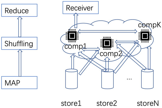 In large DML systems, MAPReduce is a commonly used distributed file storage system. As shown in Figure 2, there are three stages for the MAPReduce file systems: map, shuffling and reduce. In the system, data are stored in different nodes. In the map stage, stored data are sent to different computing nodes (e.g., cloud computing nodes), according to pre-defined protocols. In the shuffling stage, the computed results (e.g., gradients) are exchanged among nodes. Finally, the end users will collect the computed results in the reduce stage. MAPReduce can be used in federated learning, which was originally proposed for the applications in mobile devices [5]. In such a scenario, data are first sent to different worker nodes in the map stage, according to certain design principles. Then in the shuffling stage, local model parameters are aggregated in the server node. Finally, the aggregated models are obtained in the final iteration at the server. In such a way, worker nodes have all necessary data for computing local models, sent from storage nodes. However, there may be straggling worker nodes, due to either slow computing at the node or transmission errors in the channels. In such scenario, gradient coding [34] can be used to correct the straggler nodes.