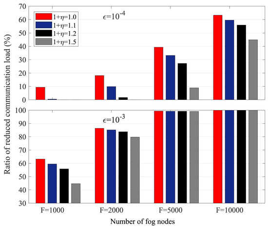 If is known at each fog node (or at least from the transmitted neighbors at each receiving node), then can be evaluated, and the computation and communication loads can be optimized through proper task assignment and code degree optimization. Theorem 3 is for gradients, and a similar analysis also holds for model parameters. In Figure 5, we show the coding gains in terms of communication loads, which are defined as the ratio of the total number of data transmitted by all the fog nodes to the data required at these fog nodes. As we can see from the figure, if the number of nodes F or straggler probability increases, the coding gains increase as expected.