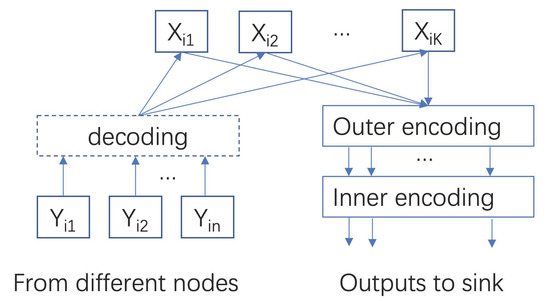 - Koetter, R.; Medard, M. An Algebraic Approach to Network Coding. IEEE/ACM Trans. Netw. (TON) 2003, 11, 782–795. [Google Scholar] [CrossRef]