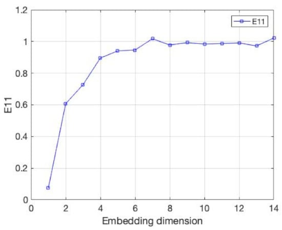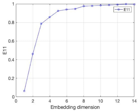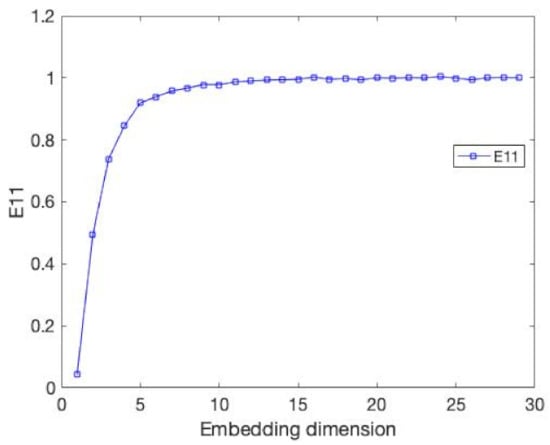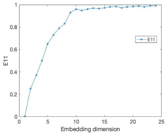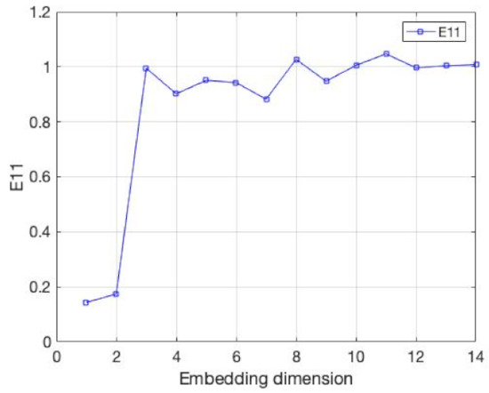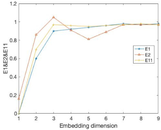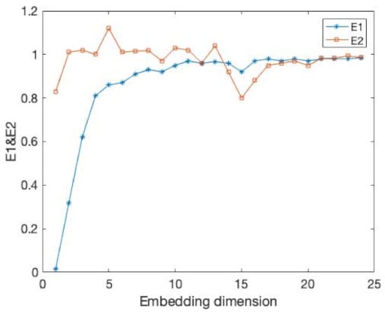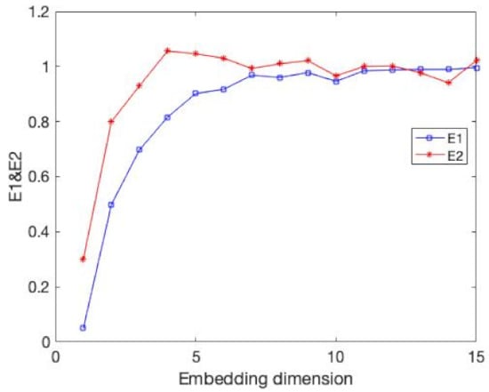 In our experiments, we found that when tends to stabilize, does not help us to determine when the embedded dimension stops increasing. Among them, we selected the daily closing chaotic time series of the CSI 500 Index from 2016 to 2021 as the experimental data. The experimental results are shown in Figure 10. The quantity of becomes stable when the embedding dimension is 5 to 6; however, the quantity of tends to be stable after the embedding dimension is 3.