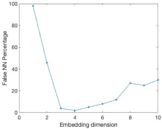 In this example, the time delay is 1. Obviously, our measure becomes stable after the embedding dimension reaches 4. At the same time, the value exceeds and tends towards 1. This demonstrates that our method can well identify the embedding dimension of this time series. At the same time, the FNN method is where cannot accurately identify its embedding dimension when faced with a time series of 1000 data points.