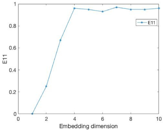 We improved this part of the shortcomings by using the quantity of RQA. Through experiments on the above data, we obtained the experimental results, as shown in Figure 11 and Table 4. As shown in Figure 11, the value of quantity becomes stable when the embedding dimension reaches 4 to 6. From Table 4, we can find that the value of quantity exceeds 0.9 after the embedding dimension reaches 5, and the certainty becomes very high. Therefore, we can effectively determine the optimal embedding dimension of the time series through quantity .