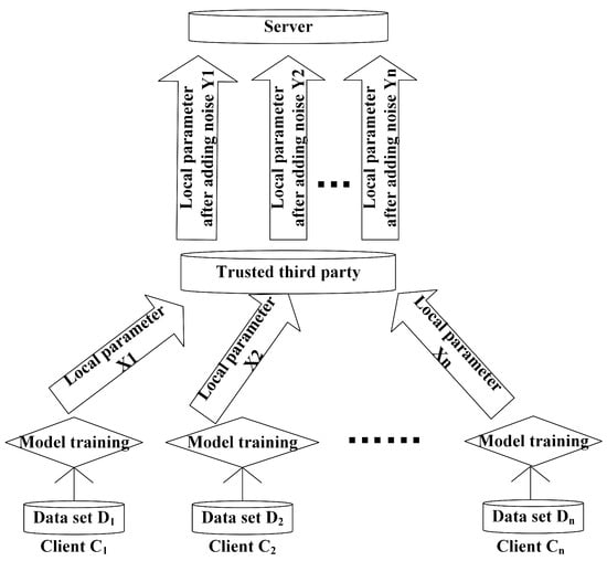 Our framework, a general distributed machine learning framework based on differential privacy: DML can train large quantities of data locally due to its distributed structure. However, in the process of DML, an attacker can analyze the model parameters () uploaded by each client to obtain the client’s sensitive information [28,29]. Therefore, we use the method of combining DP with Gaussian noise and distributed machine learning to deal with the risk of such privacy leakage. The model architecture is shown in Figure 2. In fact, it adds random noise on the basis of the general DML framework to complete DP. After the clients have trained the model locally, the model parameters () are not directly uploaded to the server, but are handed over to a trusted third party. We assume that the channel through which the clients transmit the local parameters to the trusted third party is absolutely safe and reliable. The third party adds random Gaussian noise to each local parameter (), and finally, after adding noise, the local parameters are transmitted to the server by a trusted third party to complete the aggregation and obtain the global parameter.
