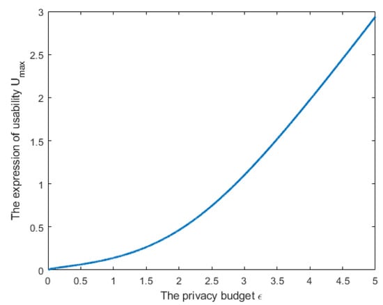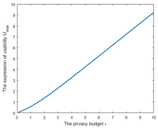 Figure 6 shows the simulation results when the privacy budget takes different values (). In this figure, we assumed that , , and . We found that when the privacy budget increased within a certain range, the value for measuring utility also increased. However, there was an upper bound, that is, when the privacy budget was out of range, the value of remained unchanged. Figure 7 plots the relationship between and . In Figure 7, we obtained the value of the expression of utility when the privacy budget . In this figure, we assumed that , , and . The ten points () were connected into a line, and finally we obtained the relationship trend between and .