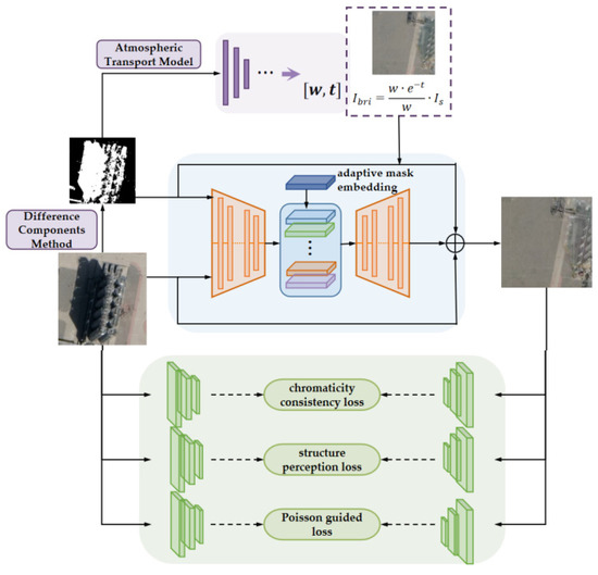 However, most methods based solely on physical models could work well with adequate information of satellite, surface and atmospheric parameters, but their performance are highly limited by the absence of prior conditions such as satellite information. To resolve these barriers, methods based on deep learning, such as pixel fusion using fusion network, u-net, flow net [23], the method of generating confrontation network [2,8,24,25,26], and the method of improving compensation based on CNN basic network [27] are proposed for shadow area image reconstruction. As for the compensation of the shadow area, the essence is allied to the enhancement of the low illumination image. Combined with the image enhancement processing idea mentioned above, the shadow removal task is similar to the removal of “noise” under conditions like thick clouds and thick fog. Li et al. [28] proposed a dark light image enhancement method based on zero reference depth curve estimation, which converts the enhancement task into the estimation of specific function, and measures the subtle enhancement quality by designing a group of differentiable non reference losses to drive the learning; the IDE proposed by Ju [29] and the IDGCP method proposed by and [30] et al. improved on the IDE are based on the atmospheric scattering model, extracting the depth ratio from the original haze image and the uniform virtual transformation. Finally, the global strategy and visual indicators to restore the scene reflectivity are used to restore the haze image.