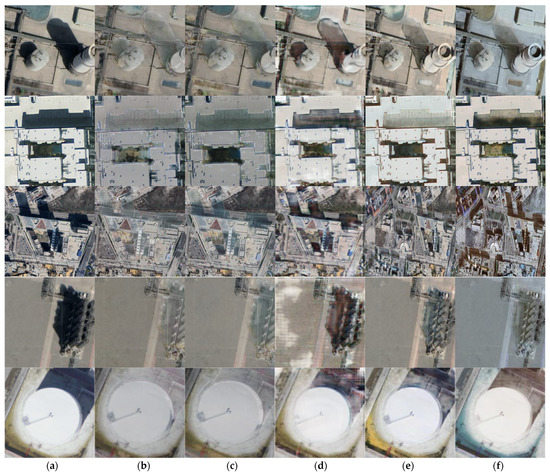 The comparison effect of the method in this paper and other methods in removing shadows from remote sensing images, where (a) is the original input image, (b) is the effect of our method, (c) is the ST-CGan model effect, and (d) is the Mask Shadow Gan model renderings, (e) is DC Shadow Net model renderings, (f) is Ghost Free Net model renderings.