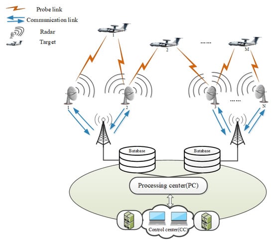 A multi-sensor cooperative detection system is composed of N sensors and M air targets. For the sake of simplicity, a two-dimensional model is considered in this paper; however, our method can be easily extended to three-dimensional scenarios. In Figure 1, every sensor can measure all targets by probe links and transmit these measurements to the processing center (PC) by communication links. In addition, the PC can send sensor measurements to the control center (CC) by communication links. Finally, the sensor scheduling scheme can be obtained according to the received measurements in CC, and then they are broadcasted to every sensor by communication links.