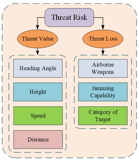 Comprehensively evaluating target threat risk from many aspects mainly includes two types, i.e., discrete risk and continuous risk. Discrete risk includes airborne weapons, jamming capability, category of target, and so on. Additionally, continuous risk includes heading angle, height, speed, distance, and so on. Furthermore, the above risks can be described in Figure 2.