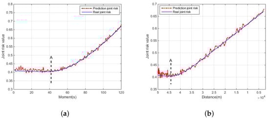 In Figure 5, the prediction risk and the real risk describe the change of joint risk. In Figure 5a,b, symbol “A” expresses the same turning point under two different physical indicators (time, distance). Moreover, before “A”, there is a greater distance between sensors and the target is longer, as expected. The loss risk of the target is the main factor of the joint risk. However, with the distance between sensor and target gradually decreasing, the loss risk probability of the target decreases, resulting in a downward trend of the joint risk. Similarly, after “A”, the loss risk probability of the target decreases too, while the threat risk of the target is the main factor of the joint risk. Additionally, the threat risk probability of the target keeps increasing, leading to an increasing trend of the joint risk. It can be seen that the curves of risk prediction and real risk are roughly the same, it can reasonably explain the risk assessment problems; moreover, it can verify the accuracy of risk prediction.