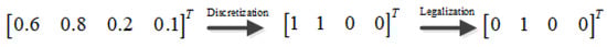 It can be seen in Figure 6, the elements in the matrix that are greater than or equal to the threshold are set to 1, otherwise 0. Therefore, a continuity matrix is transformed into a discrete 0–1 matrix. According to the given constraint, in which a sensor can only track one target and a target can only be tracked by one sensor, the sensor scheduling matrix is also legitimized. Since the elements of the first and second row in the first column are both 1, and the corresponding optimization value , the first-row element in the first column is set to 0, so as to complete the legalization.