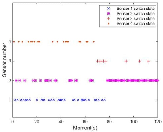 After D-L processing, the sensor scheduling scheme can be obtained by solving the optimization problem. As expected, some sensors can be scheduled to track the target scheme as shown in Figure 7.