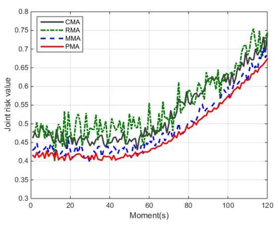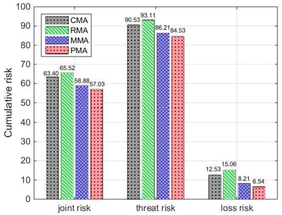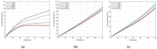 Comparing the proposed method PMA with the other three methods CMA, RMA and MMA, we analyze their joint risk assessment, which can be seen in Figure 8 and Figure 9. Here, Figure 8 is the joint risk comparison of four methods, and Figure 9 is the comparison of cumulative joint risk, cumulative threat risk and cumulative loss risk.
