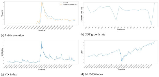 Figure 1 visualizes these aforementioned factors. From Figure 1a, people started to worry about this disease in January 2020. However, it was not until March 2020 that the COVID-19 pandemic actually caught the attention of people worldwide, as the volume of searches for COVID-19-related terms quickly peaked. This remained a topic of interest until July 2020. Furthermore, March 2020 was the month in which a pandemic-induced economic recession first occurred, seriously affecting the economy of nations worldwide. This effect is shown in Figure 1b–d. In particular, the GDP’s growth rate decreased by 3.3% in 2020, which is the highest decrease ever, even worse than the Great Recession in 2007–2009 [110]. Simultaneously, the stock market fluctuated dramatically, which can be seen via the VIX index and the index, both of which experienced a significant fall during March 2020. However, the economy started to recover afterward, the stock market became less fluctuated and the index regained its original pre-pandemic value in July 2020.