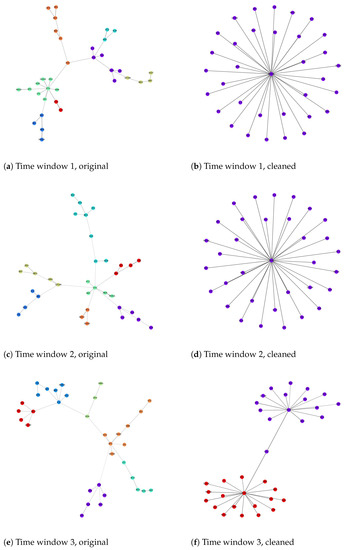 Table 4 shows the results of the two metrics using different levels of granularity. It is clear that both Residuality coefficients and Mean distance values increase significantly when the effects of noise and trend are dismissed. This phenomenon remains unchanged in different timescales, implying that this is a genuine characteristic of the cryptocurrency market. Furthermore, a visualization of network structures before and after cleaning is shown in Figure 2 to reinforce our finding. As can be seen, the topological structure changes after the noise and trends are removed. Moreover, what happens in each time window is that the number of communities decreases after removing these effects. From these figures and illustrations, we can conclude that the connections between cryptocurrencies are caused mainly by the noise and trend effects. That is, these factors result in different cryptocurrencies becoming closer to each other and forming a group. This phenomenon can be explained by low values for Residuality coefficients and Mean distance values in the original data compared to the cleaned data. A value less than unity of the prior metric means that there are few connections greater than the threshold L. Moreover, a small value of the latter metric means that cryptocurrencies within a group are closer to each other. In summary, each group of the network is compact with strong links inside, which helps the community detection algorithm to easily cluster them. In other words, the difference between different groups is clear because the links between different groups are weak, i.e., the ones greater than L. However, after cleaning the correlation matrix, cryptocurrencies that are closely related to each other through noise and trend become further away, i.e., the strong links between some cryptocurrencies are broken. This causes our metrics to increase dramatically, which means that the network structure starts to expand, forming a sparse network. For example, the Residuality coefficient of the second time window in the 30 min original data is 0.28, while it is 20 times higher after cleaning the effects of noise and trends. This fact is also true for the rest of our dataset. The result is in line with [20]; these authors did not consider the noise effect but, with the removal of trends, they found that the correlation between the 80 most liquid cryptocurrencies from 1 January 2020 to 1 October 2021 decreased.