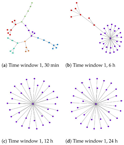 Network structure for the first time window, community detection is applied using Louvain method. Four different timescales are used, e.g., (a) 30 min, (b) 6 h, (c) 12 h, (d) 24 h.