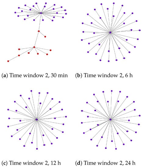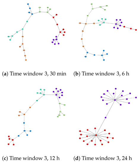 Network structure for the second time window, community detection is applied using Louvain method. Four different timescales are used, e.g., (a) 30 min, (b) 6 h, (c) 12 h, (d) 24 h.