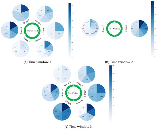 where is an element of D, with 0 indicates the complete similarity between 2 nodes while 2 indicates the complete difference between 2 nodes. From the Equation (3), we can prove that: (1) , (2) if and (3) , i.e., the requirements of a metric are satisfied [85]. By using the distance matrix, we can derive a network (graph) of cryptocurrencies (nodes) with a specific topology, where similar cryptocurrencies are close to each other and cryptocurrencies with different behaviors are far away from each other, the link (edge) between each pair of cryptocurrencies is their distance value. Thanks to this topology, different communities of cryptocurrencies can be observed.