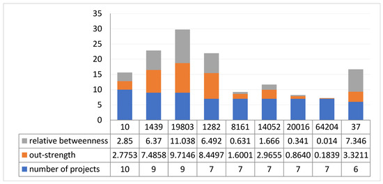 - Strength centrality: In the multi-project KCN, the weight of connecting edges between nodes is obtained by combining the collaboration frequency of two nodes and the evaluation of the collaboration content. Therefore, we first determine the top ten nodes in the network in terms of the frequency, semantic weight, out-strength, and in-strength of the active collaboration of nodes, as shown in Table 2. The order of the top ten nodes is different for each indicator value, but the nodes are completely consistent. Further, Table 2 shows that nodes with professional knowledge are willing to actively seek collaboration after entering the community, and they also occupy a central position in the network. These nodes have greater influence in the community, and other nodes are willing to actively collaborate with them. If this willingness to collaborate decreases, the network performance will be affected to some extent.