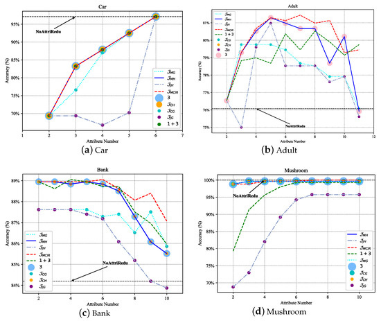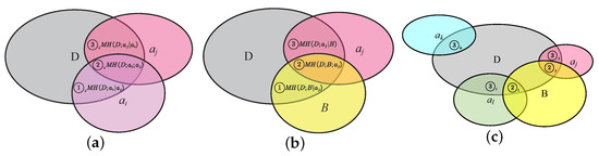 In Figure 2a, ① manifests the relevant information of selected attribute , ② means the redundant information between the attributes , , and , and ③ represents the relevant information of candidate attribute.