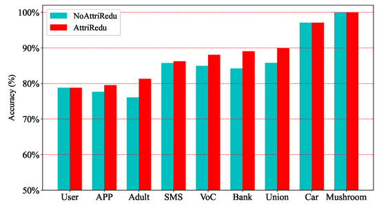 Then, Table 4 shows the number of attributes after attribute reduction for different datasets and shows the changes in performance and computation time of the MCIR-RGAD algorithm before and after attribute reduction. Note that this paper compares the performance and computation time of different algorithms in the same number of attribute reduction sets .