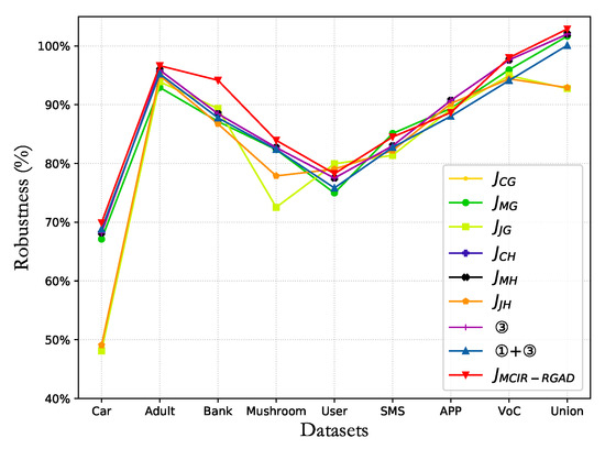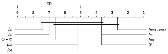 In the Nemenyi post hoc test, the performance of two models is considered to be significantly different if the average rank value of the two models is greater than or equal to the criterion distance , where the critical value obeys the Tukey distribution. By checking the table and calculating, under the confidence level , then . It can be seen from Figure 12 that the MCIR-RGAD model is optimal and significantly different from and . In addition, , , and 3 are equivalent, and is equivalent to . Namely, the model performance can be ordered as ③①+③.