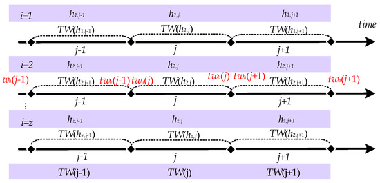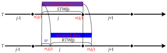 As network parameters constantly change in the hopping, a particular network parameter is only valid for a specific period, which is the time window for that network parameter, as shown in Figure 2. Then the network parameter hij corresponding to the i node at the j hopping period is valid for the time range [twa(j), twb(j)] for the hij time window, denoted as TW(hij). Since the network nodes are generally synchronous hopping, the time windows of the parameters corresponding to each node are fully overlapping, i.e., TW(h1j) = TW(h2j) = … = TW(hzj) = [twa(j), twb(j)], so they are denoted uniformly as TW(j). In the normal case, the time window within which the data is sent is the sending time window STW(j)= [sta(j), stb(j)]. After receiving the data within the time window, the time window for receiving the data can be denoted as receiving time window RTW(j) = [rta(j), rtb(j)]. The set of times at which data arrives after it has been sent within the time window is the arrival-data time window ATW(j) = [atb(j), atb(j)]. In the ideal case of no network delay, RTW (j) = STW(j) = ATW(j).