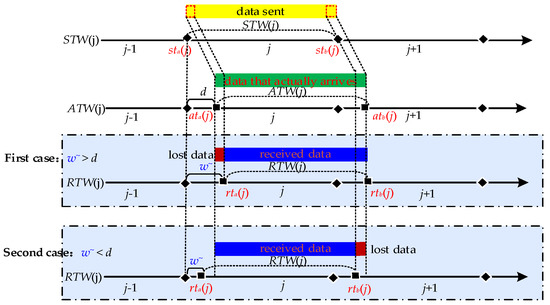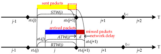 In hopping networks, some mechanisms are usually designed so that all legitimate nodes can sense the change of H in real time, so the regular communication of legitimate nodes is unaffected. However, some transmission packet loss is still generated during a short period of time when H is hopped, which is called delayed packet loss. As shown in Figure 3, the specific cause of delayed packet loss is that ATW(j) is slightly delayed by a period of time compared to STW(j) due to the presence of network delay d, which results in RTW(j) not being able to cover ATW(j) completely. As a result, different methods have been tried to make RTW(j) cover ATW(j)as much as possible. We summarize the descriptions in the literature [15,16,17], where they present two methods for RTW(j) to cover ATW(j). One is to maximize RTW(j) coverage of ATW(j) by extending RTW(j) on the basis that STW(j) does not change [14]; the other is to shorten STW(j) on the basis that RTW(j) does not change, which is equivalent to delaying RTW(j) to give it a chance to cover ATW(j) completely [15,16], but both methods have drawbacks.