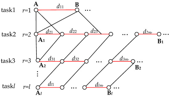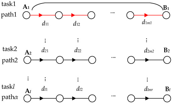 (3) Depicts multiple data tasks for the whole network. In the observable network, any two or multiple nodes in the network are connected as a single path. Thus, there are multiple paths (α) across the network, and in most cases, there are multiple data tasks (l) on a single path. Then, after observing the data tasks on this one path, we can further examine the data tasks on multiple paths. Since data tasks on multiple paths are more complex, we first examine data tasks on one path. By observation, accumulating the network delay for each data task can be used as the total network delay for the data tasks on this path. Then similarly, based on (4), accumulating the delayed packet loss for multiple data tasks on the path one can be used as the total delayed packet loss for this path (see Figure 12). The total delayed packet loss on path one can be expressed as: