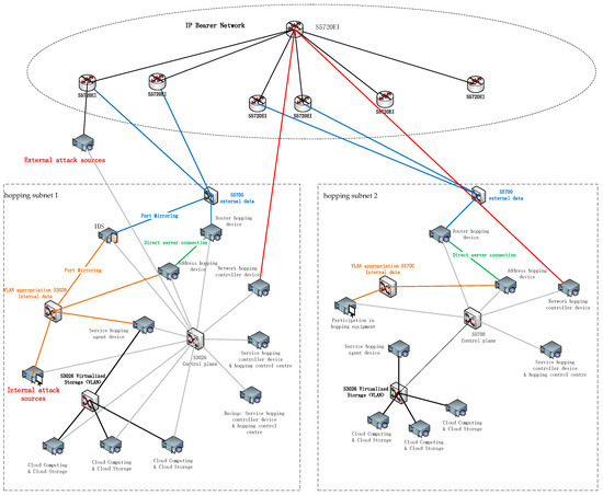 For the actual examination environment, the physical connection topology of the network is shown in Figure 16. The system is composed of two hopping subnets; hopping subnet 1 and hopping subnet 2 are connected through the IP bearer network. After the start of the network hopping, the source address and source port of the IP packet of the data platform in hopping subnet 1 after the hopping process are transmitted through the two WAN ports of the S5700 router through the IP bearer network to the hopping equipment in hopping subnet 2 after restoration, and then they are transmitted by the visitors in the data plane, thus completing an ordinary network transmission process.