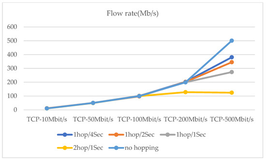 The maximum network transmission rate is 100 Mbit/s under the national standard for category 5 network cables. Network hopping is initiated at one hop/10 s, one hop/5 s, and one hop/2 s, respectively. In addition, a network transmission stress test was conducted (see Figure 17. Moreover, the performance test of the router hopping was carried out at a network transmission pressure of 500 Mb/s (Figure 18 and Figure 19). The experimental results show that the performance of the router still has a relatively large improvement based on various indicators with the use of delay time windows.