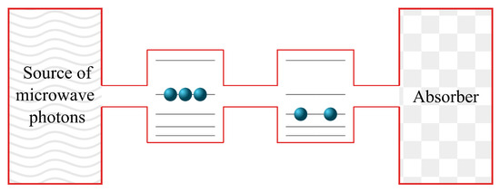 Pictorial presentation of the considered model. The figure shows two coupled non-linear micro-cavities with three photons in the first cavity and two photons in the second cavity. It is assumed that the microwave photons are injected into the first cavity by using a generator of the microwave field, and the transmitted photons are absorbed with some probability by a measurement device.