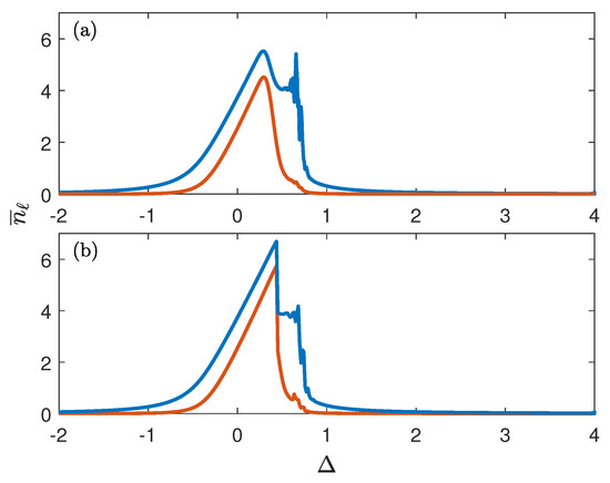 where are complex amplitudes of the local oscillators. The numerical simulations were performed by using the fourth-order Runge–Kutta method. It is found that for non-zero the system (4) relaxes in course of time to some attractor which determines the system’s stationary response to the external driving. In what follows, we shall be interested only in attractors whose basin contains the point . For and , we found these attractors to be simple focuses (in the rotating frame), where the populations approach their stationary values depicted in Figure 3a by the blue and red solid lines. However, in the interval these simple attractors bifurcate into the limit cycle, where the steady state solution of Equation (4) corresponds to periodic oscillations of the oscillator amplitudes with the frequency not related to the driving frequency, see Figure 3b. (Bifurcation of a simple attractor into a limit cycle in the driven dissipative two-site BH system was discussed earlier in Refs. [8,9] where the authors considered a specific model with non-local driving and dissipation. Additionally, when addressing the quantum system, the authors focussed on the transient dynamics for particular initial conditions but not on the stationary regime). In addition to this characteristic frequency, we also introduce the mean squared amplitudes where the bar denotes the time average. We depict these quantities in Figure 3a by using the same line styles. Comparing now Figure 2b and Figure 3a we conclude that bifurcation of the classical attractor is well reflected in the quantum dynamics of the BH dimer already for .