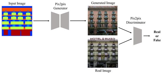 Pix2pix model is an image-to-image translation method that converts an image of one domain into an image of another domain []. Pix2pix is a type of generative model that aims at image-to-image conversion, i.e., mapping input images to output images using an image dataset. Just like other GANs, there is generator that forms new images from input images and a discriminator that separates the artificial images generated by the generator from the actual image. Pix2pix is also a type of generative model. Like GAN, the discriminator learns to classify real data as real and artificial data as fake, while the generator learns to discriminate between the data formed by the generator and the real data. In other words, the generator tries to lower the classification performance of the discriminator, and the discriminator has the nature of adversarial learning to form a structure in which each other develops competitively in the direction of increasing the classification performance. As shown in Figure 2, while a general GAN generator requires a noise vector as an input, Pix2pix additionally requires an input image rather than a noise vector [,,].