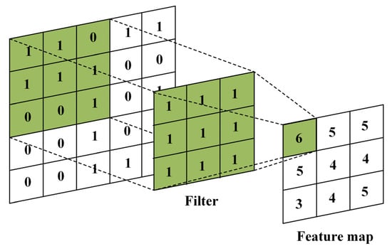 The data input to the CNN is composed of a three-dimensional tensor of height, width and channel, which is displayed in the form of a matrix. One convolutional layer consists of as many filters as the number of channels in the image. The output of the convolutional layer is determined by applying a filter to each channel. In general, a filter in the form of a square matrix, such as a 3 × 3 or 5 × 5 matrix, is used. When a filter is applied to each pixel, as shown in Figure 3, a feature map can be obtained from the calculation. The feature is the result of filter being traversed at a specified interval, and each pixel value is calculated and outputted using the sum of element-wise multiplication. In this case, the filter interval can be changed by designating a stride. Figure 3 shows the calculated feature map with a stride set to one, and the filter moves by one to execute the pixel operation. Fixed-size convolutional networks have been applied to many applications, among others, handwriting recognition [,], machine-printed character recognition [], online handwriting recognition [] and face recognition [].